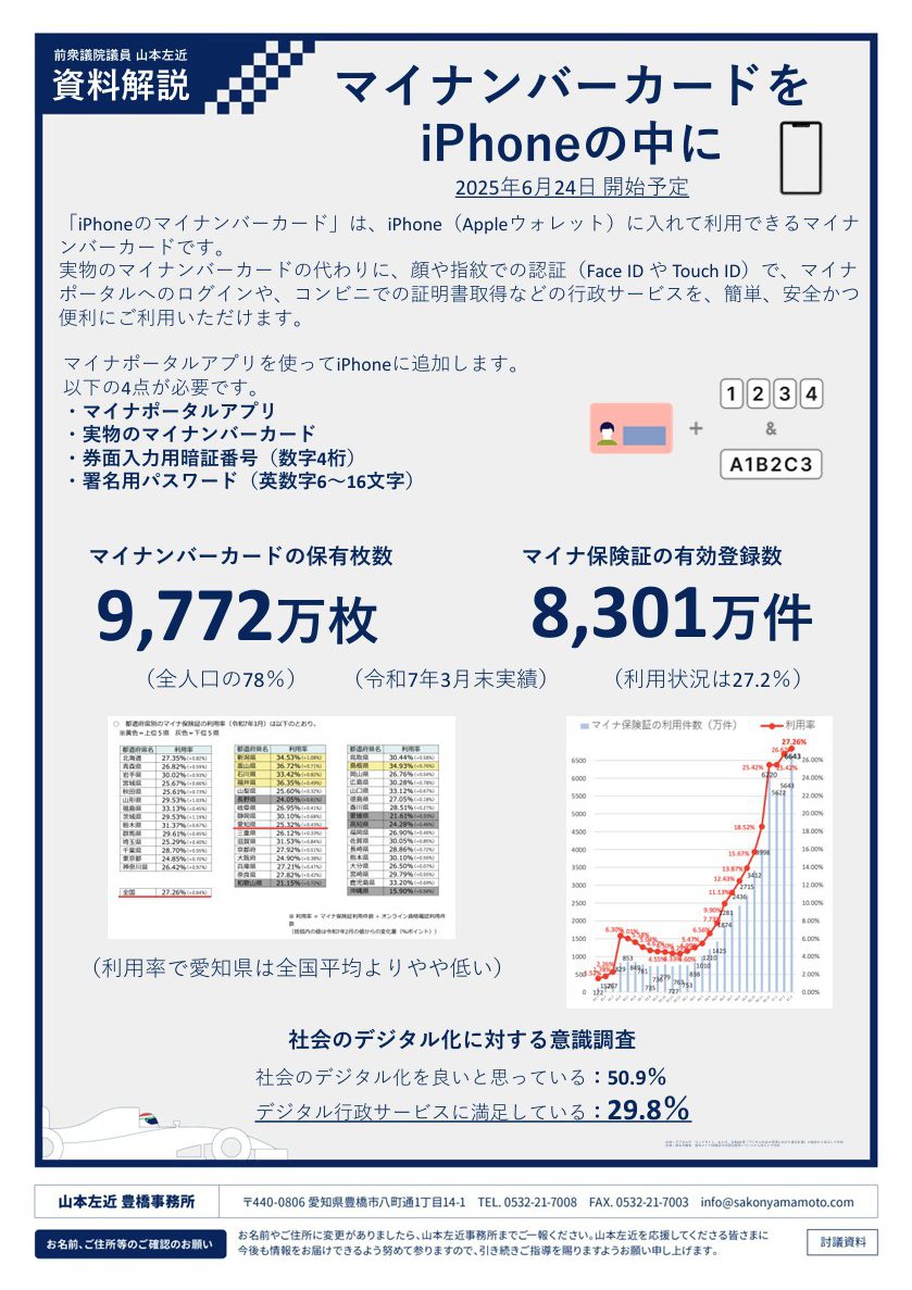 令和7年6月24日から、マイナンバーカードの様々な機能をiPhone(以下、iP)で利用できるようになります。これに先行して、アンドロイド端末では令和5年5月11日から同様のサービスが開始していました。今回はマイナンバーカードのスマホ搭載について解説していきたいと思います。