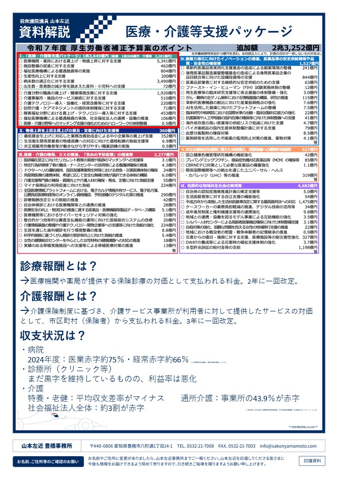 医療・介護の深刻な経営危機を踏まえれば、補正予算による緊急支援や、今後の診療・介護報酬の見直しは、決して「バラマキ」ではありません。医療・介護という社会の重要なインフラを守るための“命綱”であり、国と自治体が果たすべき「責任ある支援」と位置づけるべきです。