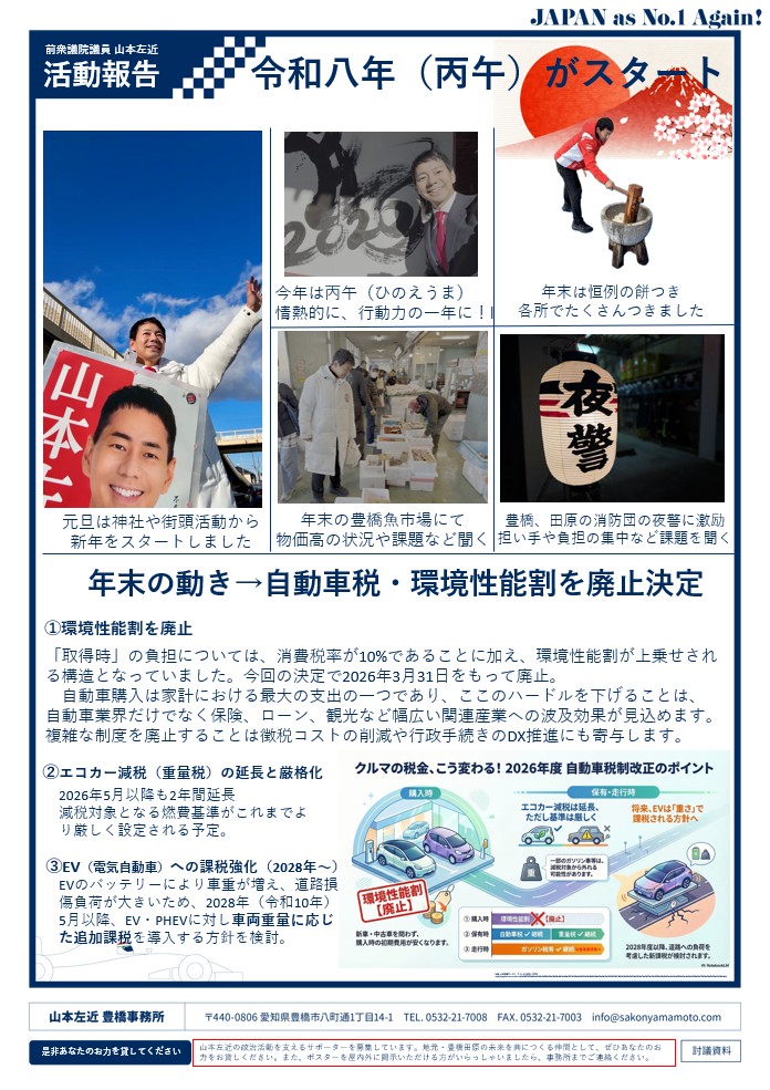 昨年末には、令和8年度当初予算案が閣議決定されました。賃上げや物価高対策、科学技術への投資、地方創生、防災・国土強靱化など、日本が進むべき方向性が示されています。重要なのは、こうした政策を、暮らしの中で「変わった」と実感していただける形につなげていくことです。