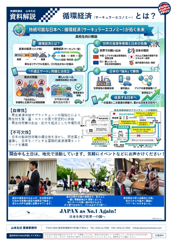 そこで今国会では、「廃棄物処理法の一部改正案」を提出しています。この改正により、たとえ有価物であっても、使用済みの金属やプラスチックであれば廃棄物と同様の「許可制」の対象とします。これにより、悪質な業者を排除し、国内の貴重な資源が不正に海外へ流出するのを食い止めます。